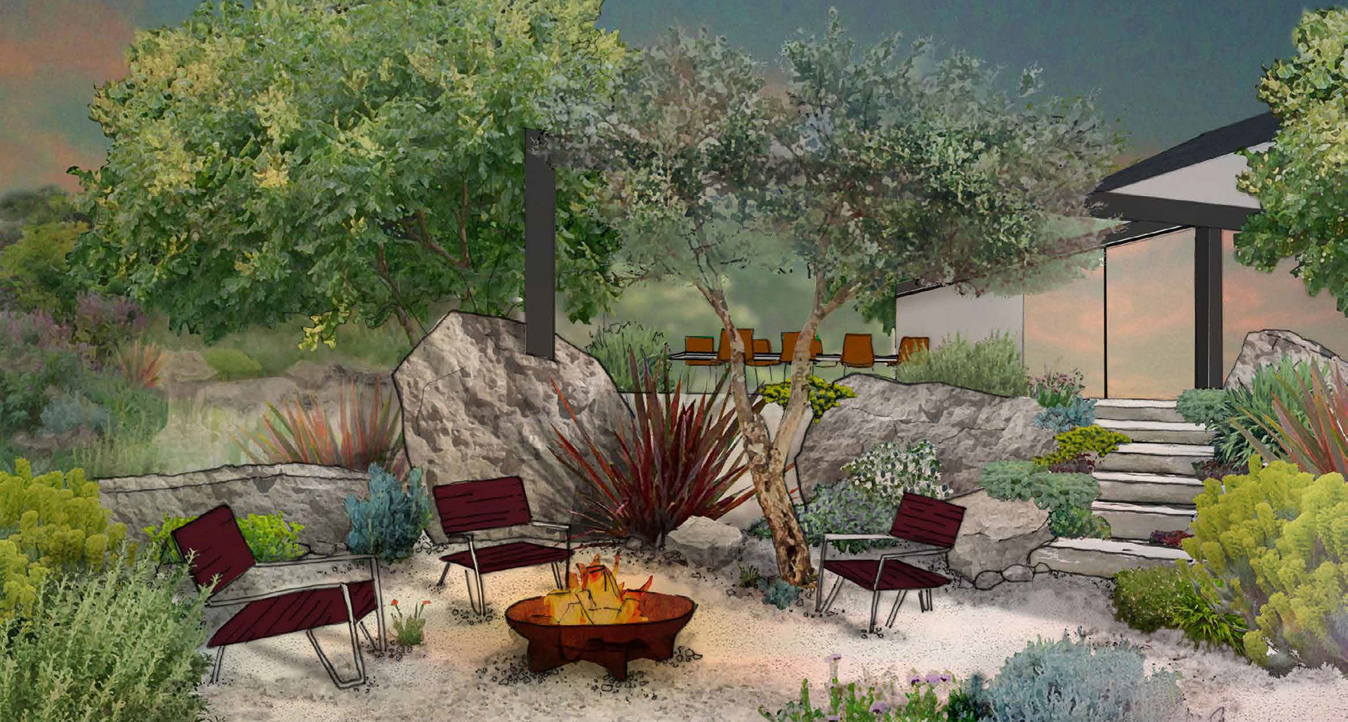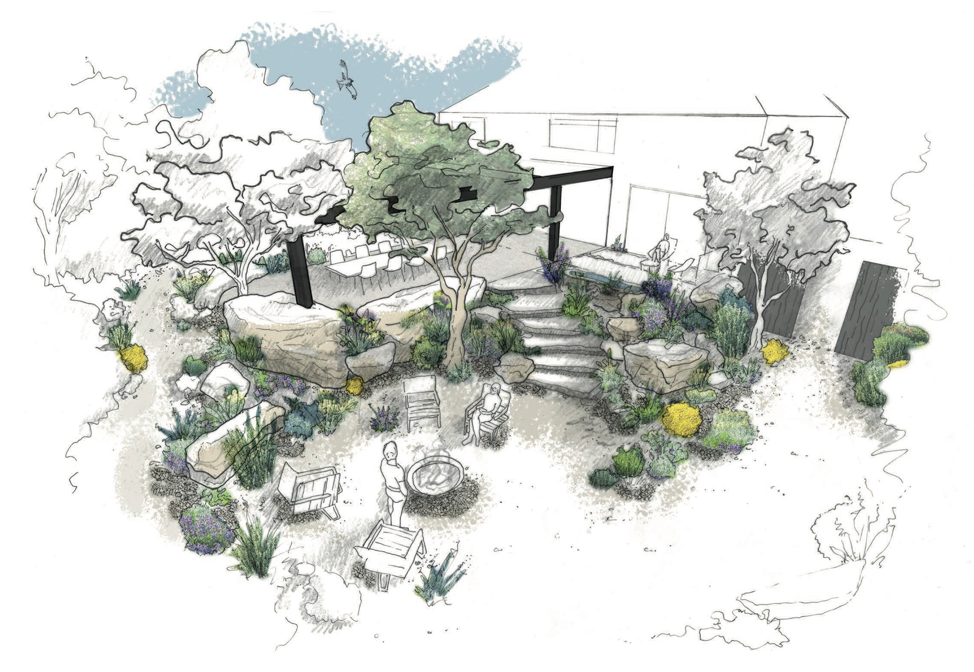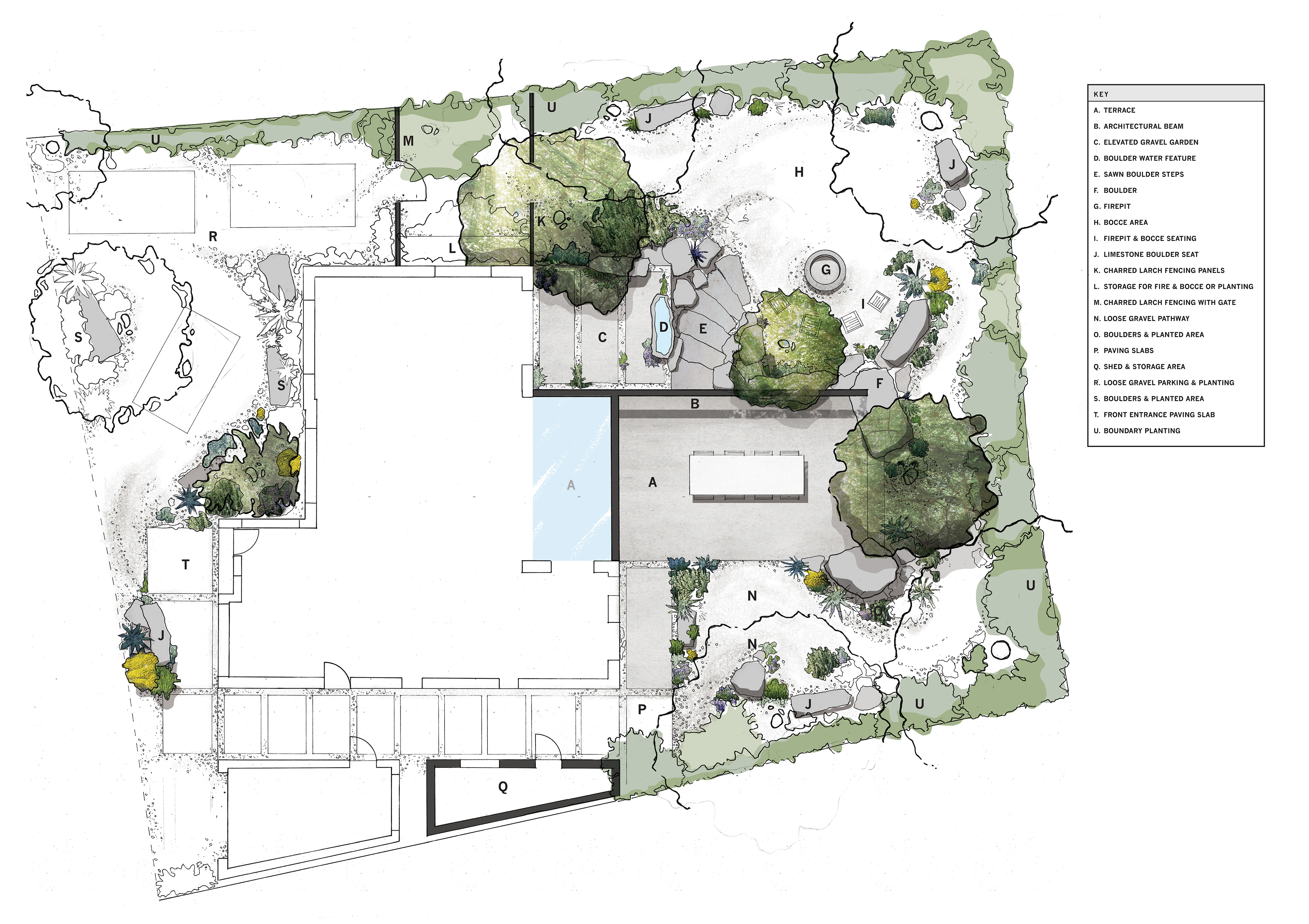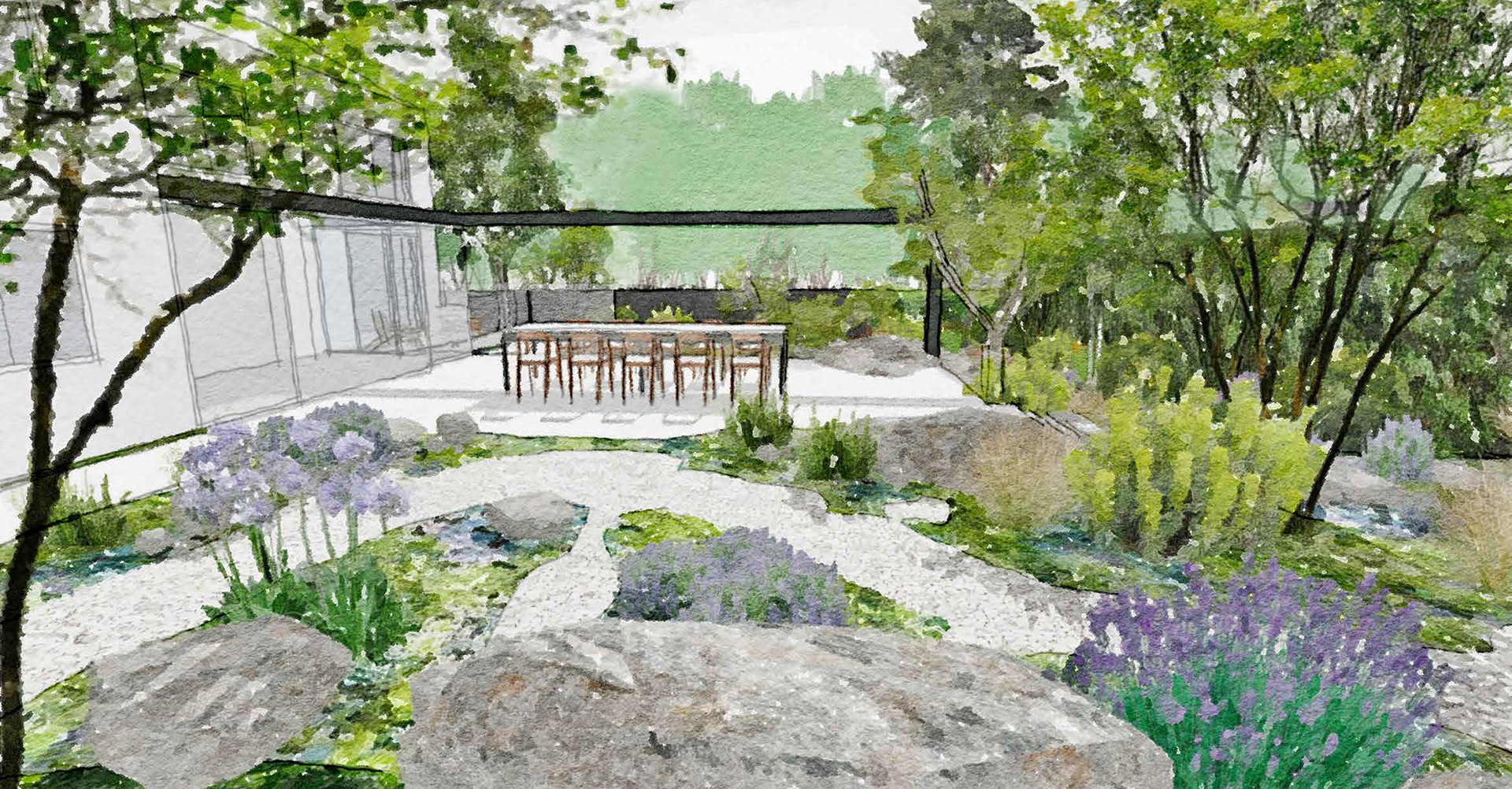 A residential garden inspired by the winterbourne chalk streams of the Chilterns, exploring movement, flow and seasonal change. A meandering dry stream connects spaces for gathering, retreat and views to the surrounding landscape, balancing a strong architectural framework with naturalistic, resilient planting.